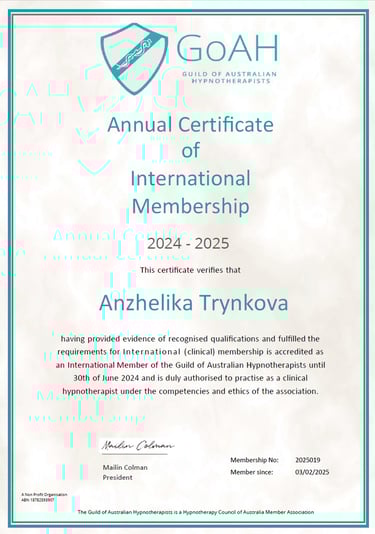 I am a professionally trained, certified hypnotherapist in accordance with Australian standards, recognized as among the strictest in the world for the hypnotherapy profession.